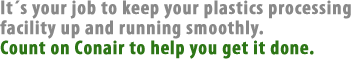 Celebrating its 50th year in bussiness in 2006, Conair alredy offers the plastics industry the best and broadest line of auxiliary equipment in the world. Still, we know that´s not enough. You expect Conair to stay ahead of the curve, not only satisfyng your needs today, but also anticipating the requirements you'll have in the year to come.